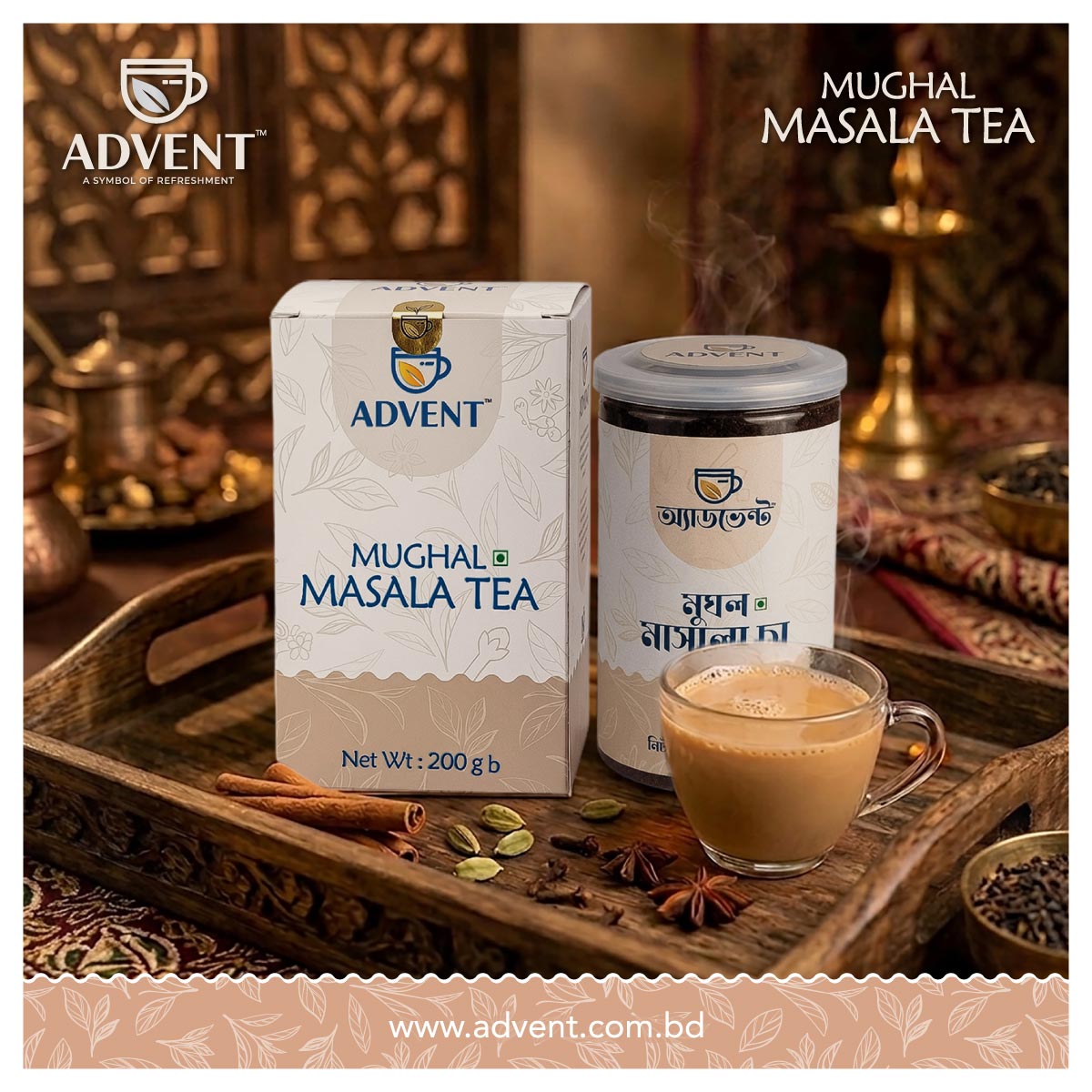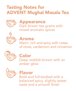 With every sip, enjoy a harmonious symphony of spice and tea, rich in fragrance and flavor. Advent Mughal Masala Tea unfolds heritage and elegance, one exquisite cup at a time.